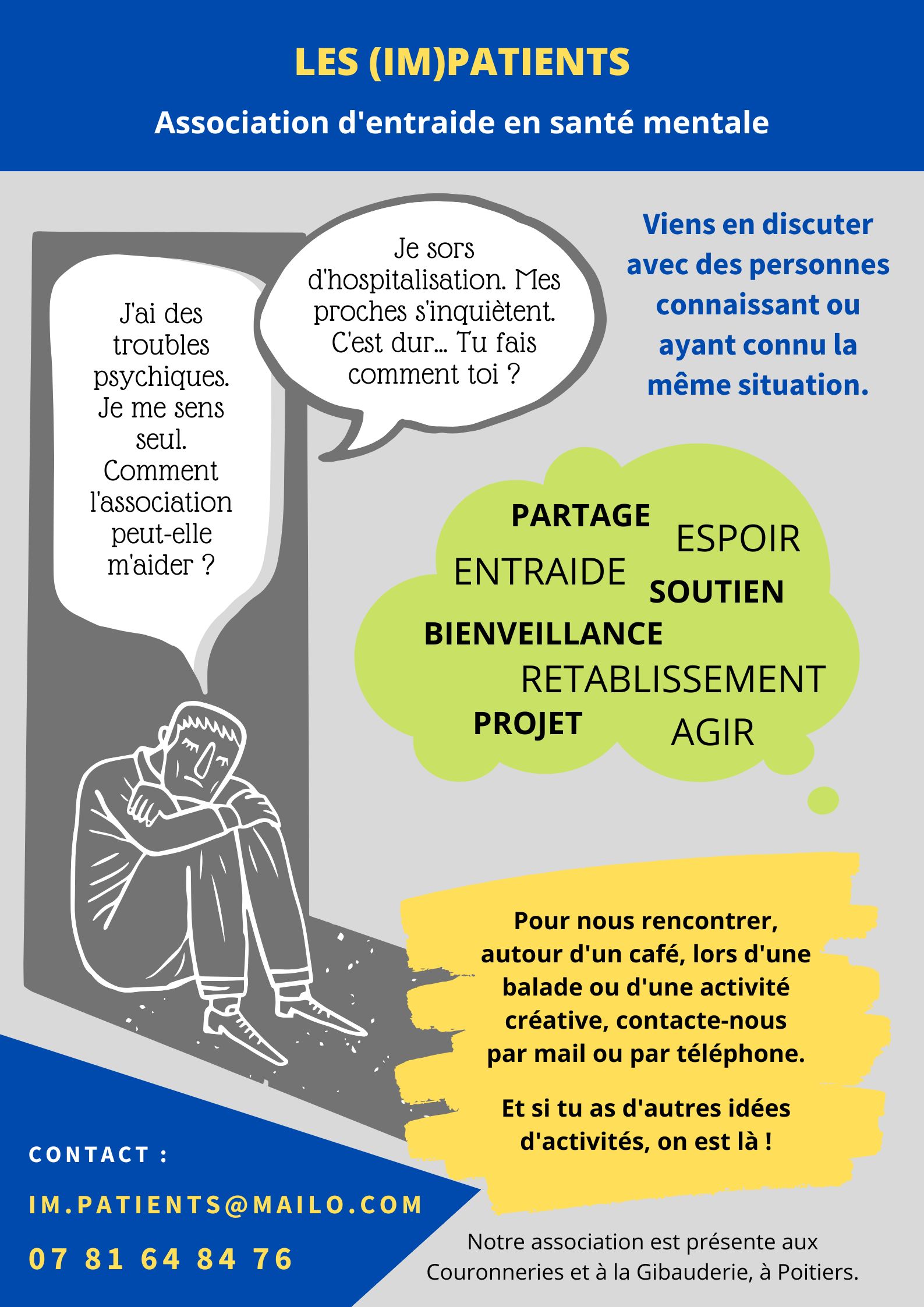 Chez Les (Im)patients, nous pensons qu'il est temps de sortir du rôle passif de "patient" pour devenir des acteurs actifs de notre propre rétablissement. Notre nom, un brin provocateur, reflète notre envie de bouger les lignes et de faire avancer la psychiatrie à Poitiers. Nous sommes les "impatients" qui souhaitons voir changer les choses, ensemble.
